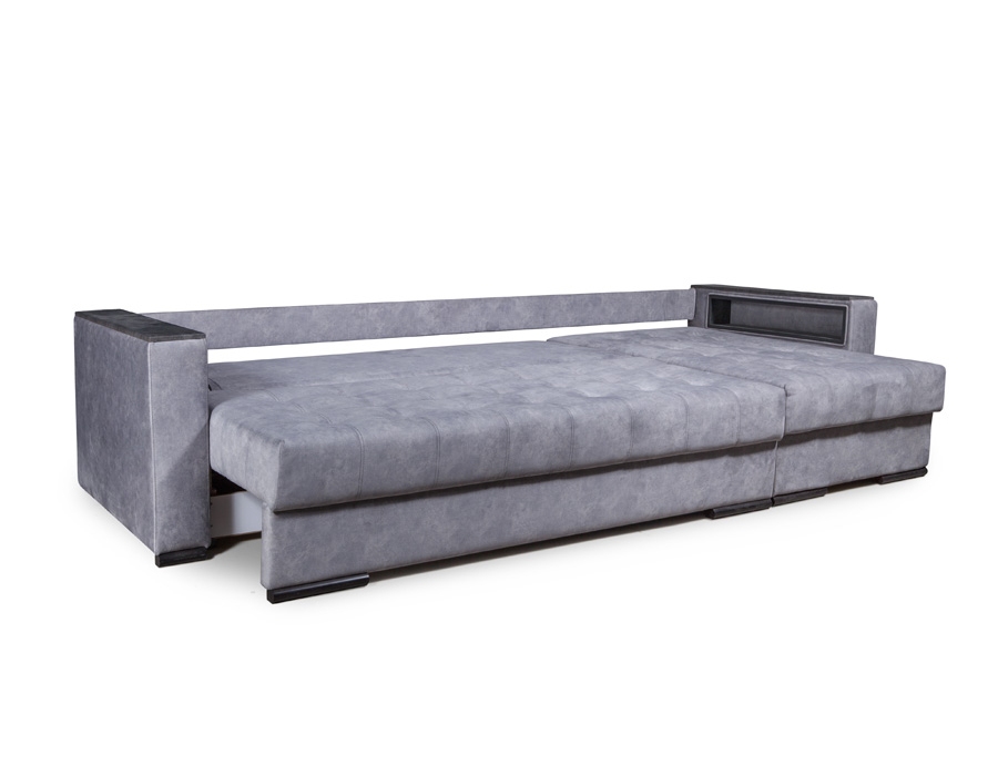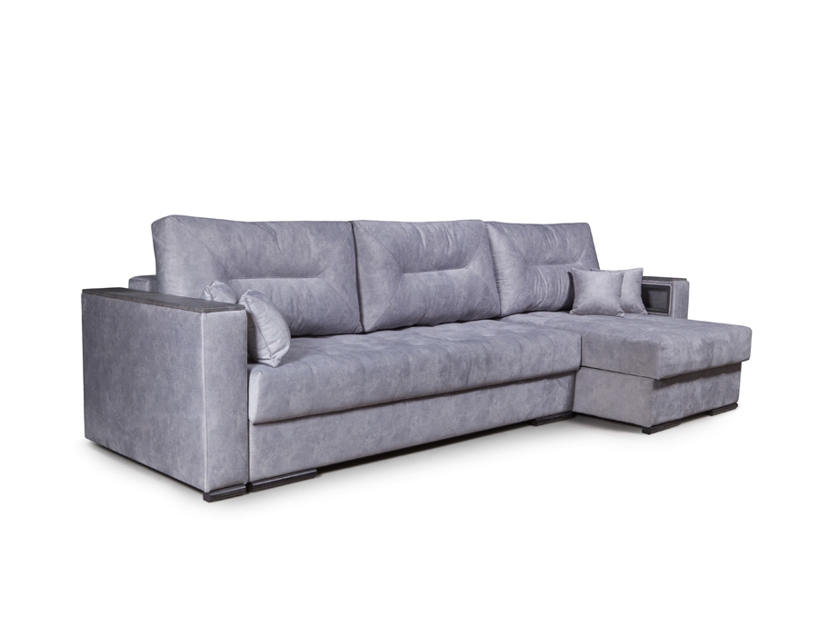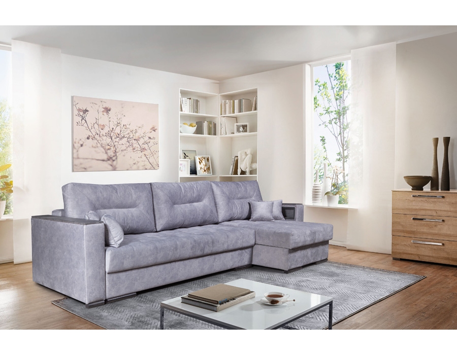 Угловая секция наделяет диван оптимальной функциональностью, позволяя заметно сэкономить пространство. Вариант подлокотников с нишей наделяет диван дополнительной функциональностью, в то время как мягкие подлокотники — тренд, сохраняющий единство образа. Вариант с нишей для хранения позволяет держать полезные мелочи под рукой, а на столешницу всегда можно положить телефон. На диване можно комфортно спать, не разбирая его. В разложенном виде диван образует просторное спальное место.